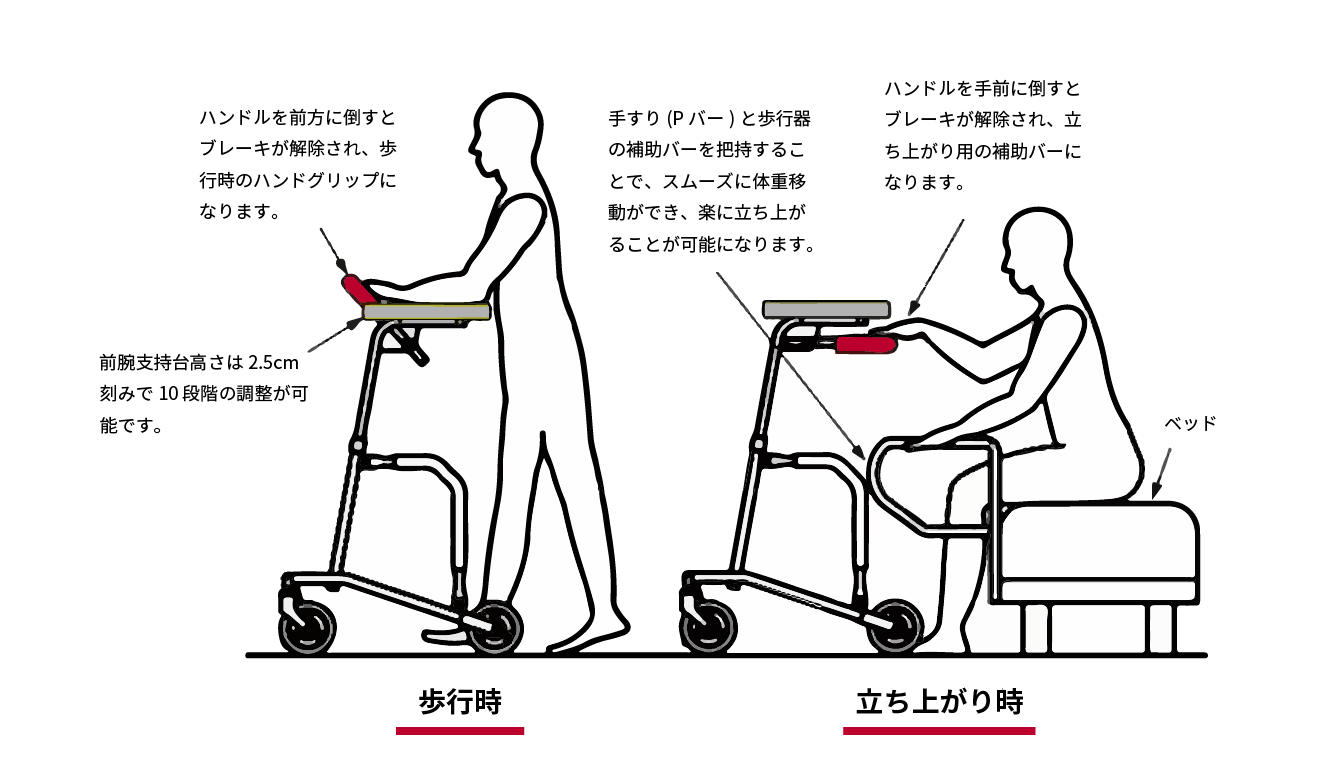 1.ロック機構により歩行器を起立時の支えとして利用できる!